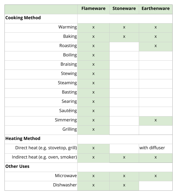 If you’re looking for clay that can withstand direct heat, you want flameware. It’s a combination of clay, silica, and a lithium ore like spodumene. Flameware is fired up to 2387F or more and in the process the ore goes through an expansion process that later prevents the clay body from reacting to rapid temperature changes. Just like the other types of pottery, the clay body dictates the types and behaviors of the glaze. A glaze that you’d use on stoneware plates cannot be used on a flameware skillet.
