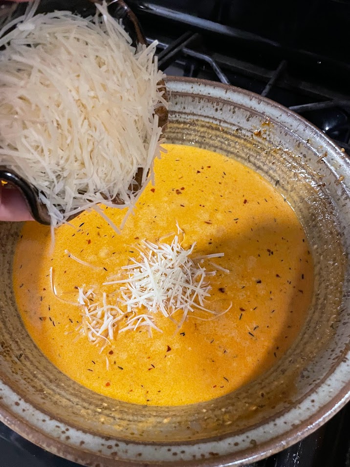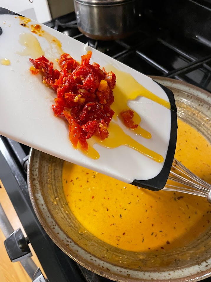 Watch the cream closely, reducing the heat if necessary, to maintain a gentle simmer. - Stir in the parmesan and the sun-dried tomatoes.