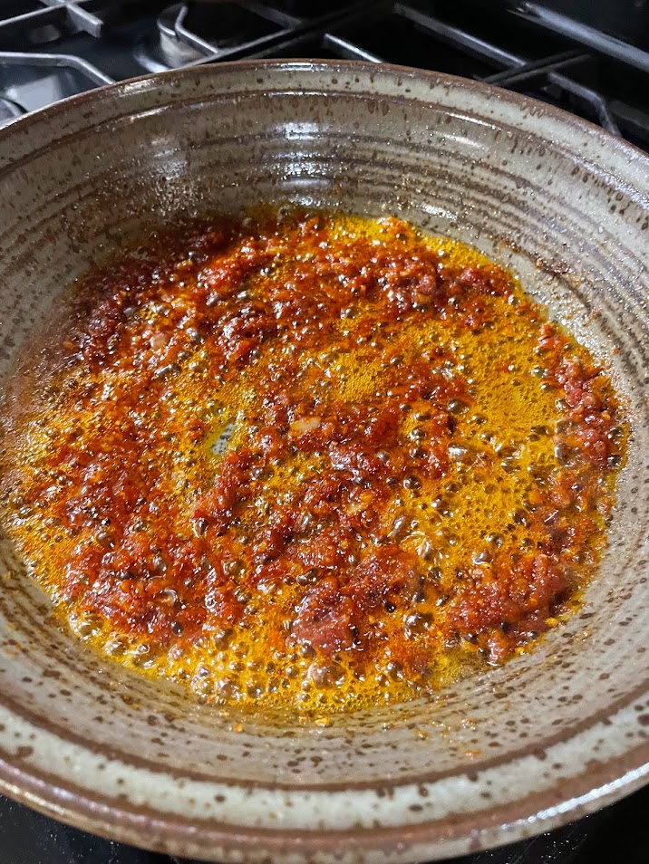 - Add the tomato paste, stirring until the color darkens, about 2 minutes.