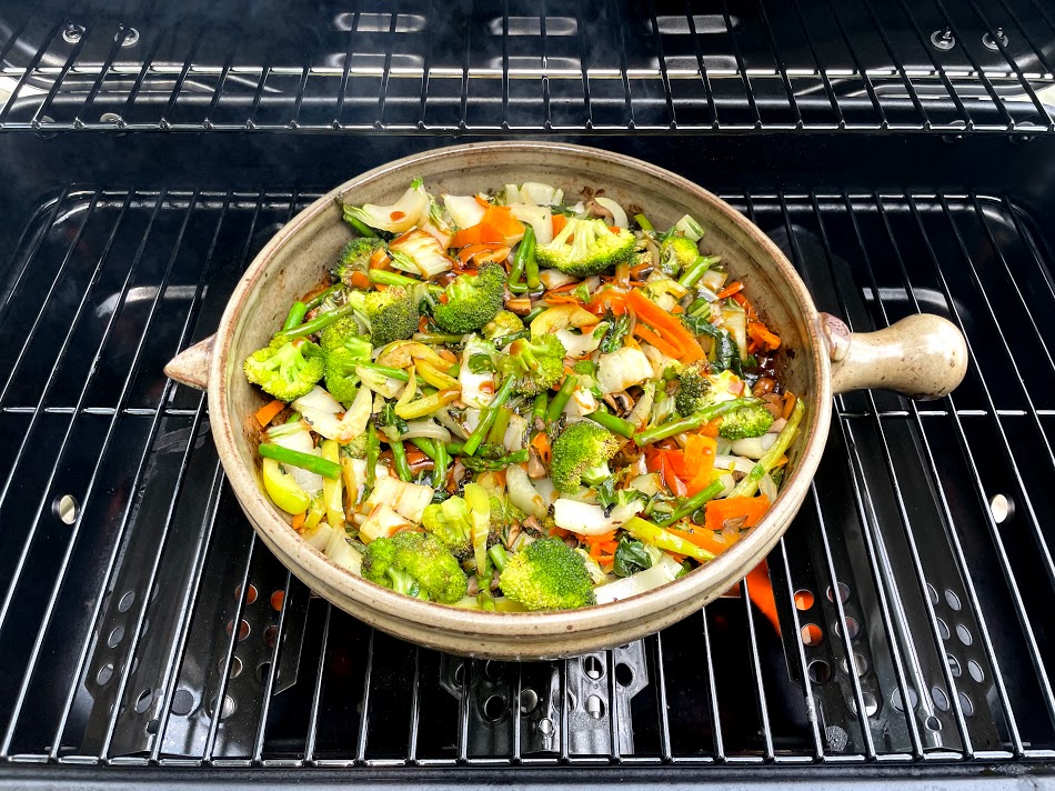 • Basically any vegetables you have. The secret to have them cook up evenly is by chopping them according to their density. Mushrooms and cabbage are less dense than carrots or broccoli.