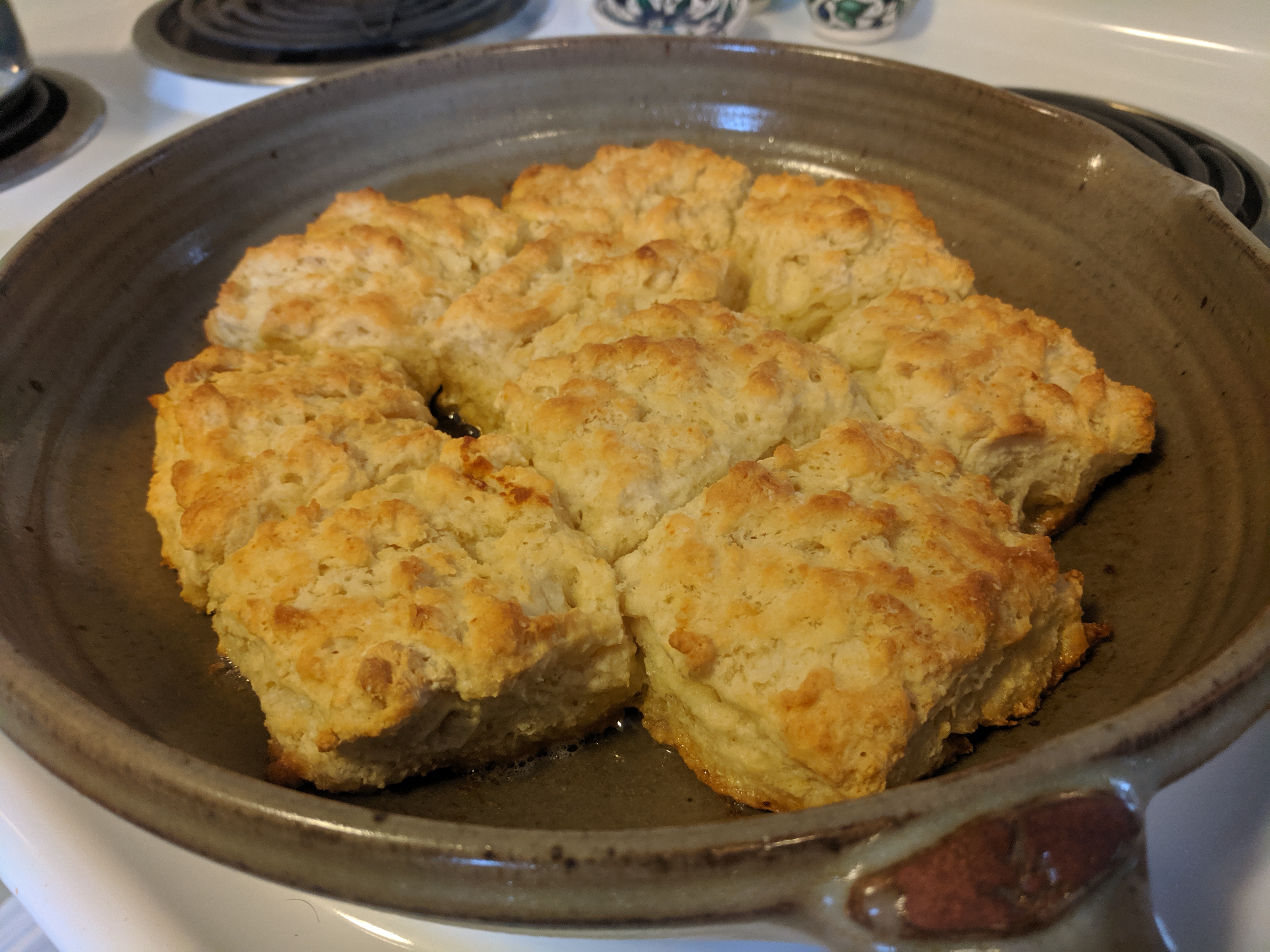 While looking online for recipes, I was searching for simplicity. There are a lot of opinions out there about what techniques make good buttermilk biscuits. I read about folding the dough three times, folding it four times, cutting your butter into both thin slices and pea sized cubes, mixing in the butter with your hands, mixing it in with a rubber spatula, crowding the pan, not crowding the pan, and . . . I think you get the picture. There was one common thread in all the recipes – cold ingredients, especially the butter. This is the real key to fluffy biscuits. Eventually I discovered this recipe from Damn Delicious. It features simple ingredients, relatively few steps, and is meant to be done in a cast iron skillet. I had to improvise a bit during the process; I neglected to locate a box grater before starting. But overall I stayed true to the recipe, while using our flameware skillet instead of cast iron, and the biscuits turned out great.