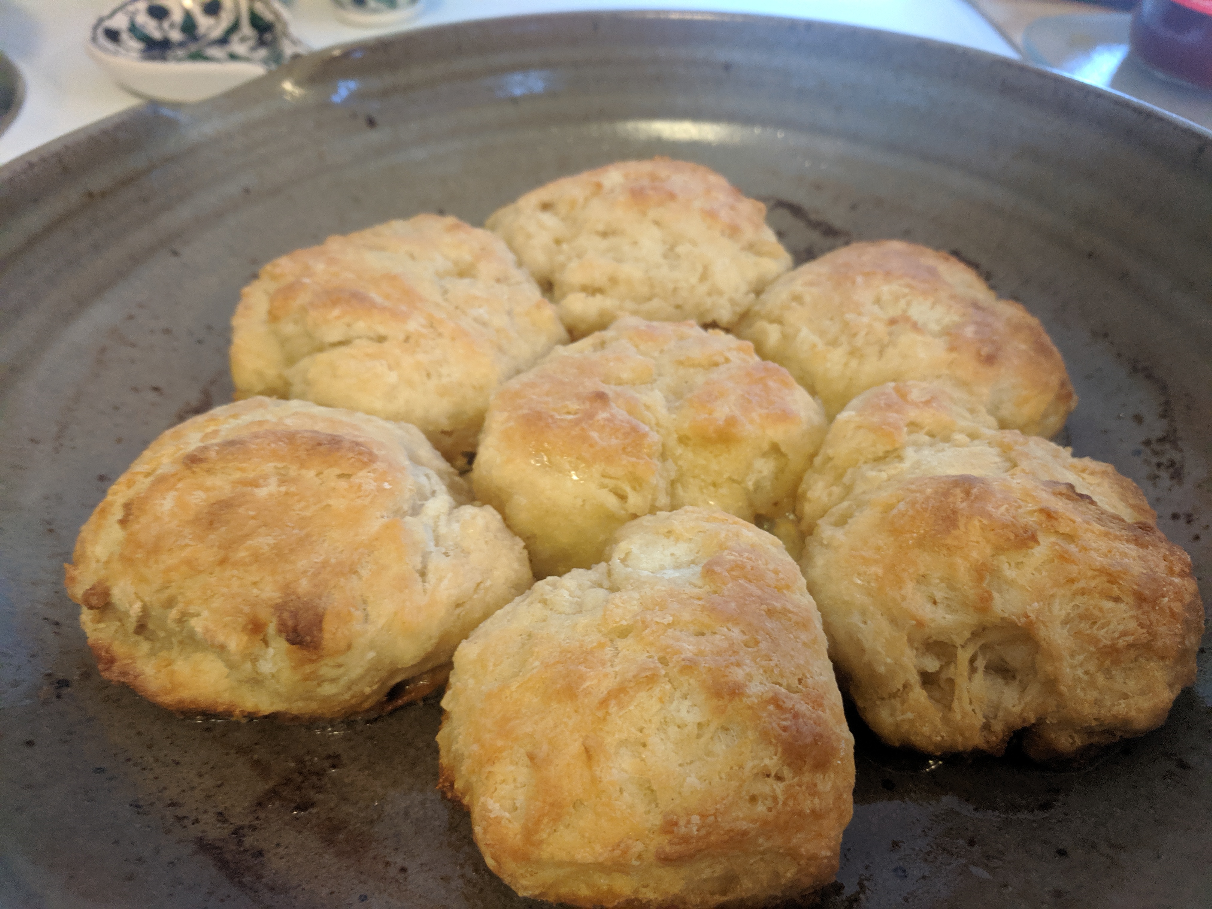 This recipe made a lot of biscuits. I ended up getting around fifteen out of it, and had to bake them in two batches. I pulled the first batch, ate one, and plated and covered the rest in foil. I felt good about the results after eating that first biscuit. It was fluffy, buttery, and had a crisp top and bottom. The rest of the biscuits I delivered to the Clay Coyote, where I knew there would be some ready and willing taste testers. After everybody went back for a second biscuit, I was feeling really happy with myself.