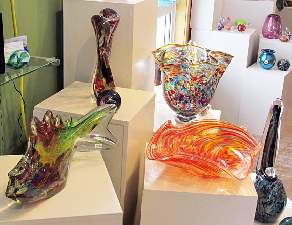 At Clay Coyote Gallery, we like to keep the glass pieces in or around our window so that you customers can fully appreciate the depth and color of the pieces. Used to the process of creating pottery, we are fascinated by how glass pieces are blown. Click here to see some of the wonderful artists that we carry at the gallery.