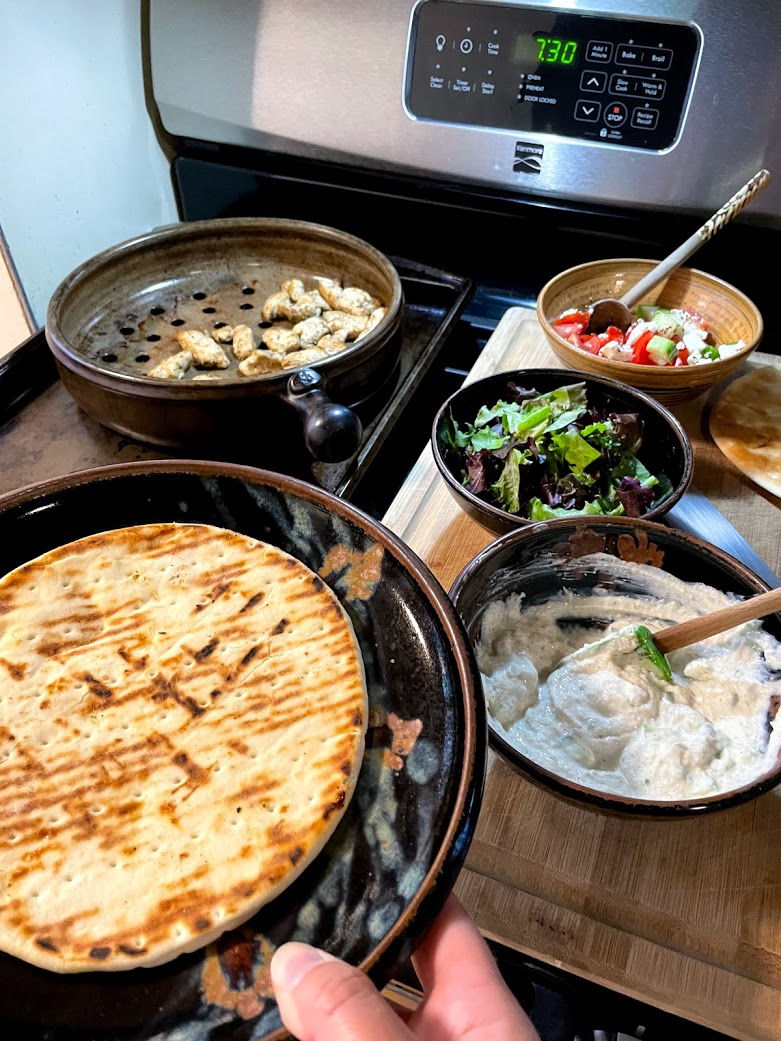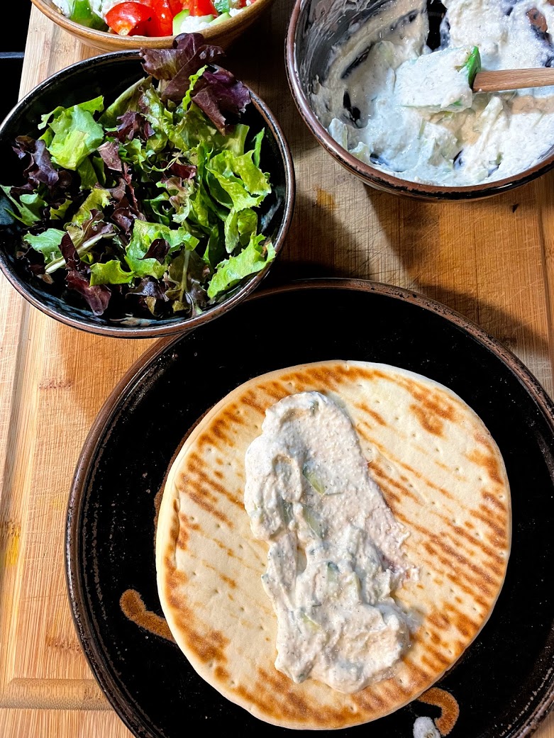 - Warm pita (I did it on the grill, but you can use oven, toaster, or even 5 seconds in the microwave).