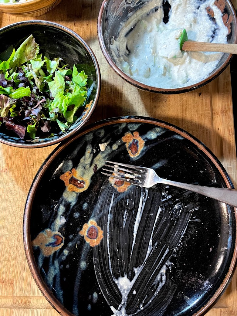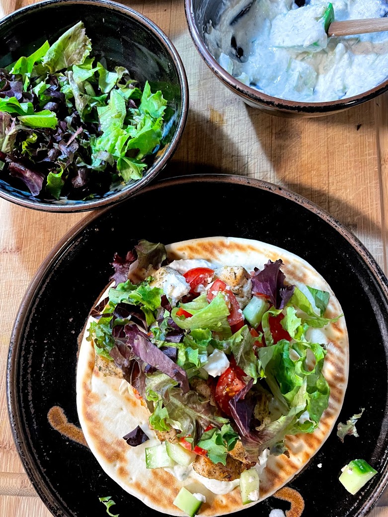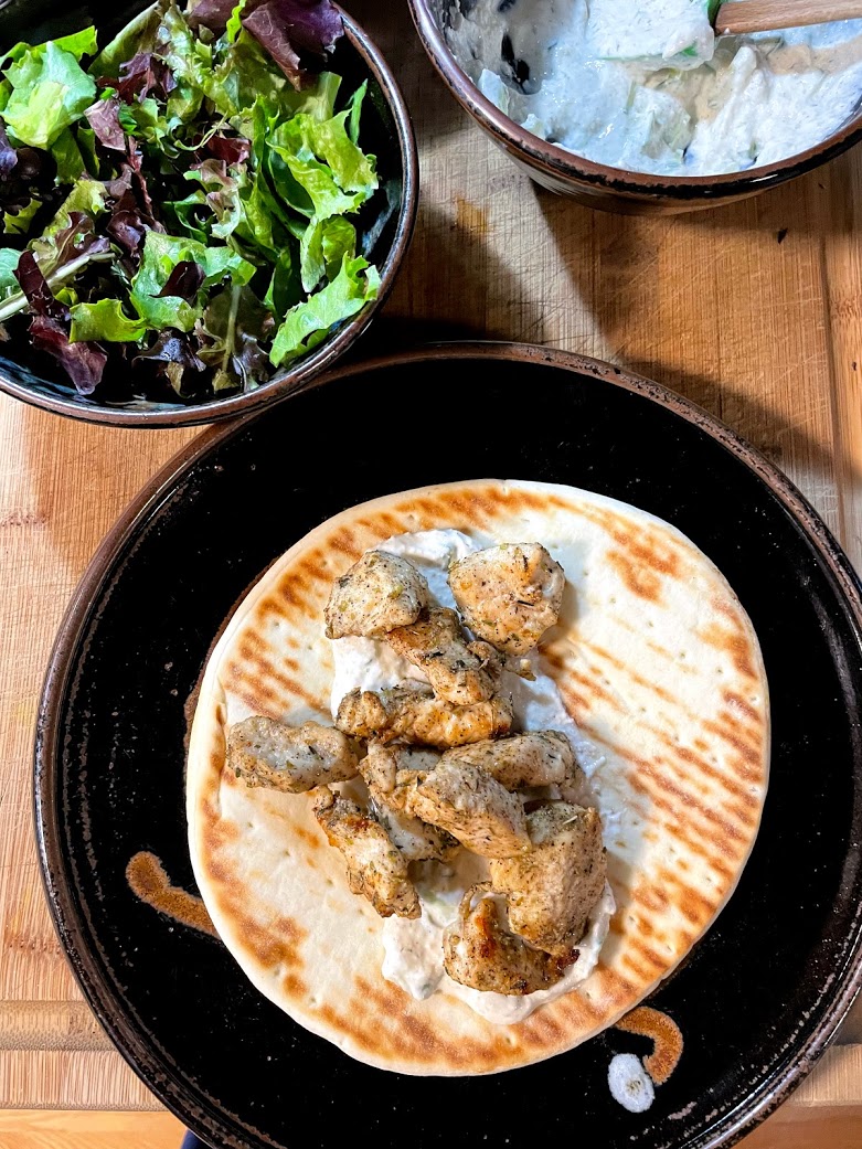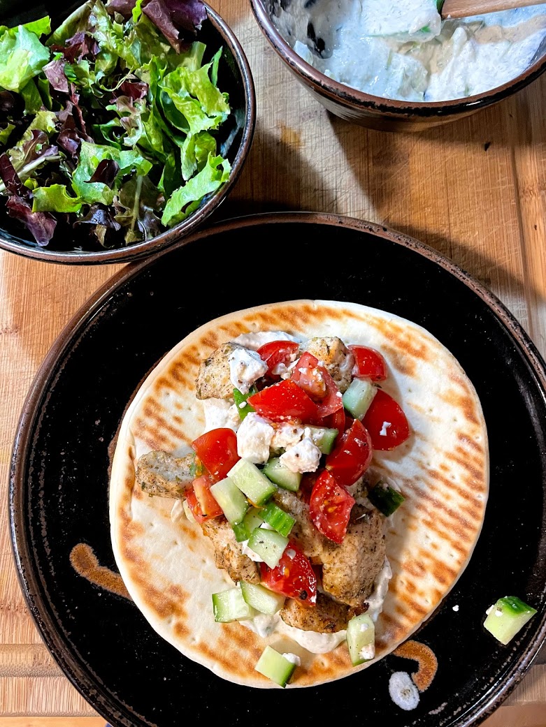 - We made a batch of tzatziki sauce: 1 container plain Greek Yogurt (5 oz), 1/2 cup fresh cucumber chopped up very small, 1 teaspoon garlic, 1 teaspoon onion, 1 teaspoon mint, 1 teaspoon dill, squeeze of lemon juice, and a pinch of salt. If you use fresh mince everything. I had a dried blend and it’s still amazing.