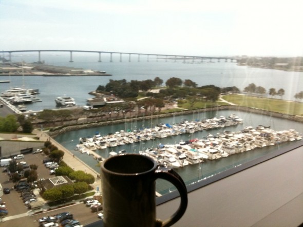 Now, on to a recent sad story. Just two weeks ago, the Travel Mug went to San Diego for a conference. But unfortunately, as tends to happen at so many conferences these days, the Travel Mug just sat in the window of the hotel room, and gazed, longingly out on the clear, blue ocean. It was a sad day indeed for the Travel Mug, she wanted to badly to strap on a pair of roller-blades and hit the promenade, but alas journalism conferences cater to the sun-averse. Here is the Mug seen looking out on the horizon, so close yet so far…