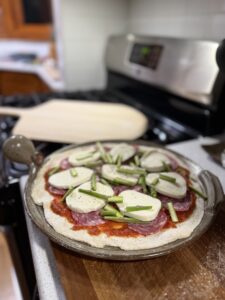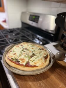 Living in Italy changed my whole life; it gave me a deep appreciation of Italian food and traditions that continues to influence my cooking today. One of my favorite memories was at a little pizzeria on a piazza a little off the lake called Pizzeria Messicanna, and they served elongated pizzas on wooden boards. The pizzas were huge and they were individual sized. I learned how to use my fork and knife to fold over the dough of each bite, making little tiny pizza pockets. And everyone around me could finish these massive pizzas. My favorite combo was called the Valdastora. It was a red sauce with prosciutto, asparagus, and instead of mozzarella, they used fontina cheese. My red sauce is pretty simple.