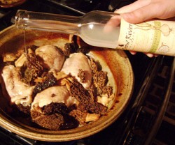 I then placed the tagine back on my stove top, added around 1/2 cup of garlic wine, morels, and simmered for another 10 minutes.