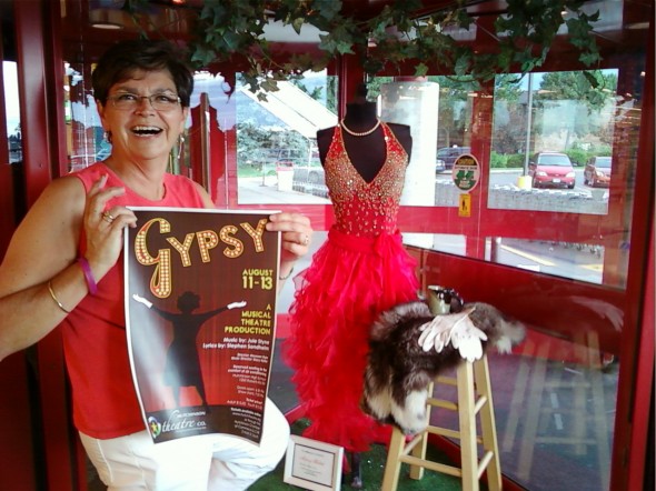 Then, if that wasn’t exciting enough, the Mug headed to Cashwise to put up the window decorations for Hutchinson Theater Company’s rousing rendition of Gypsy! Look at it on the perch! (Hey, that stool is making the rounds too!)
