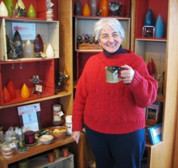 The travel mug has returned to the Clay Coyote for our annual spring open house. Here it is with Margaret Ann taking a tour of our gallery.