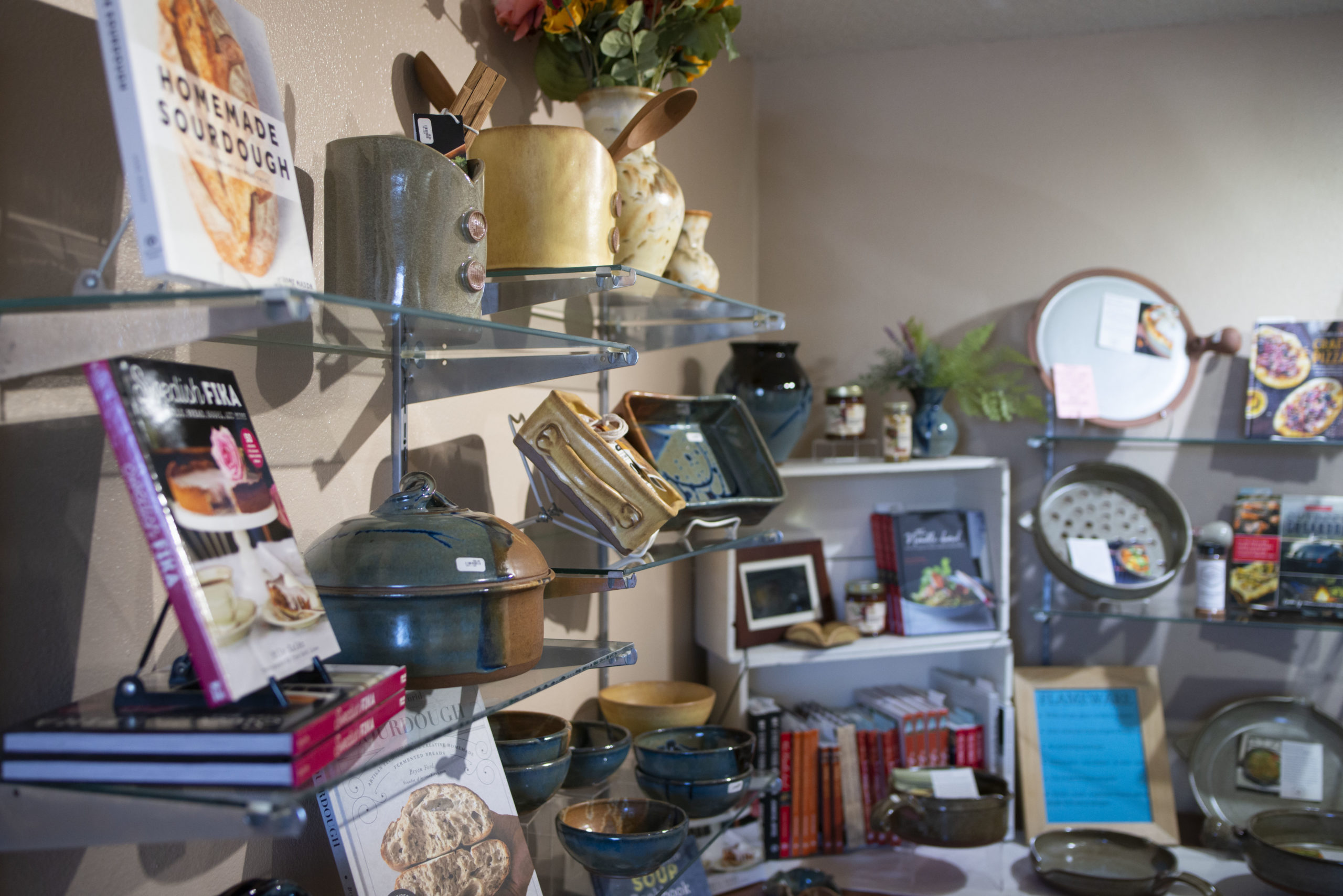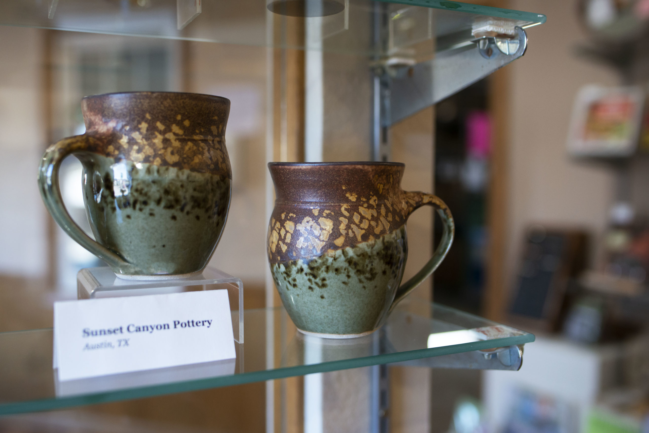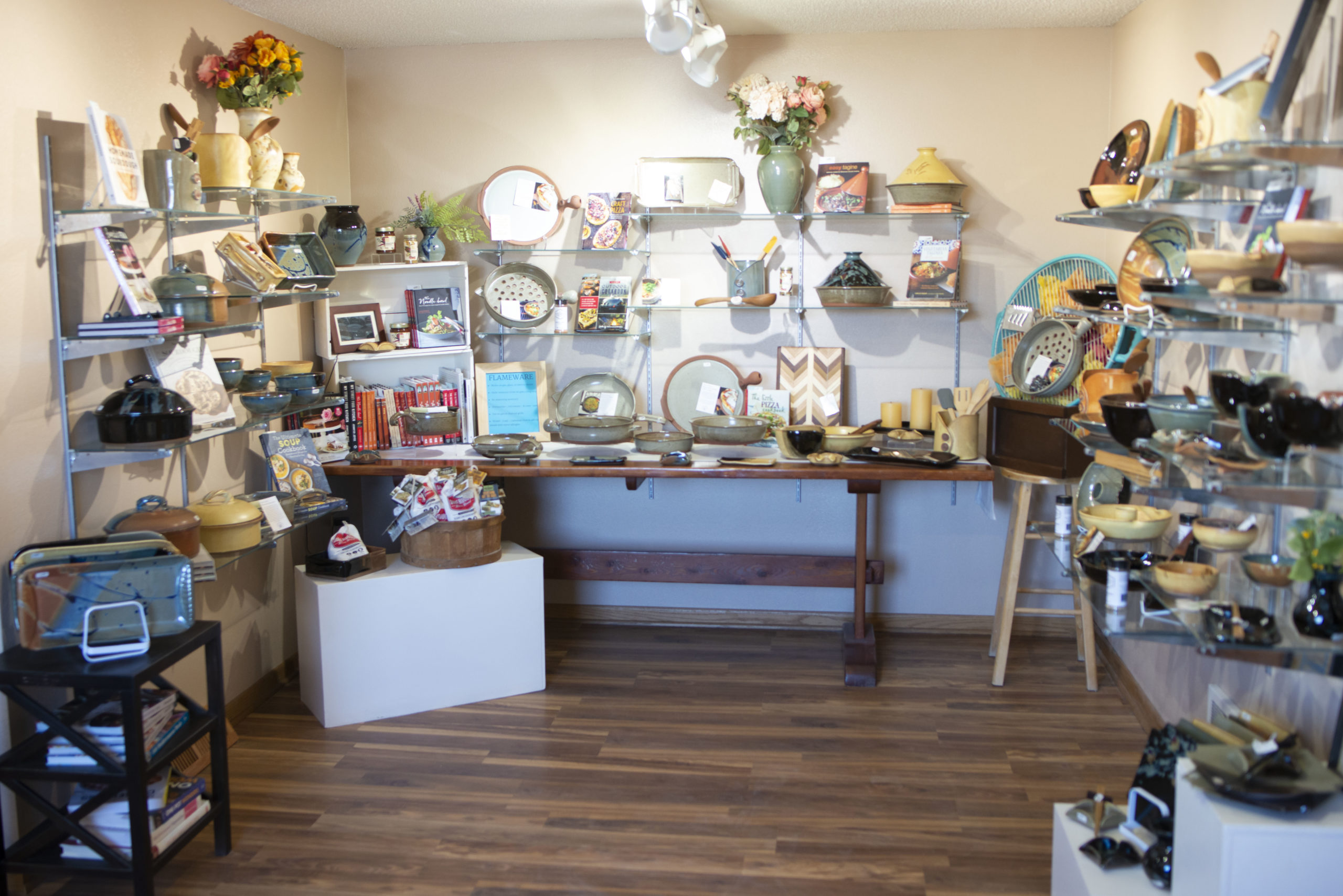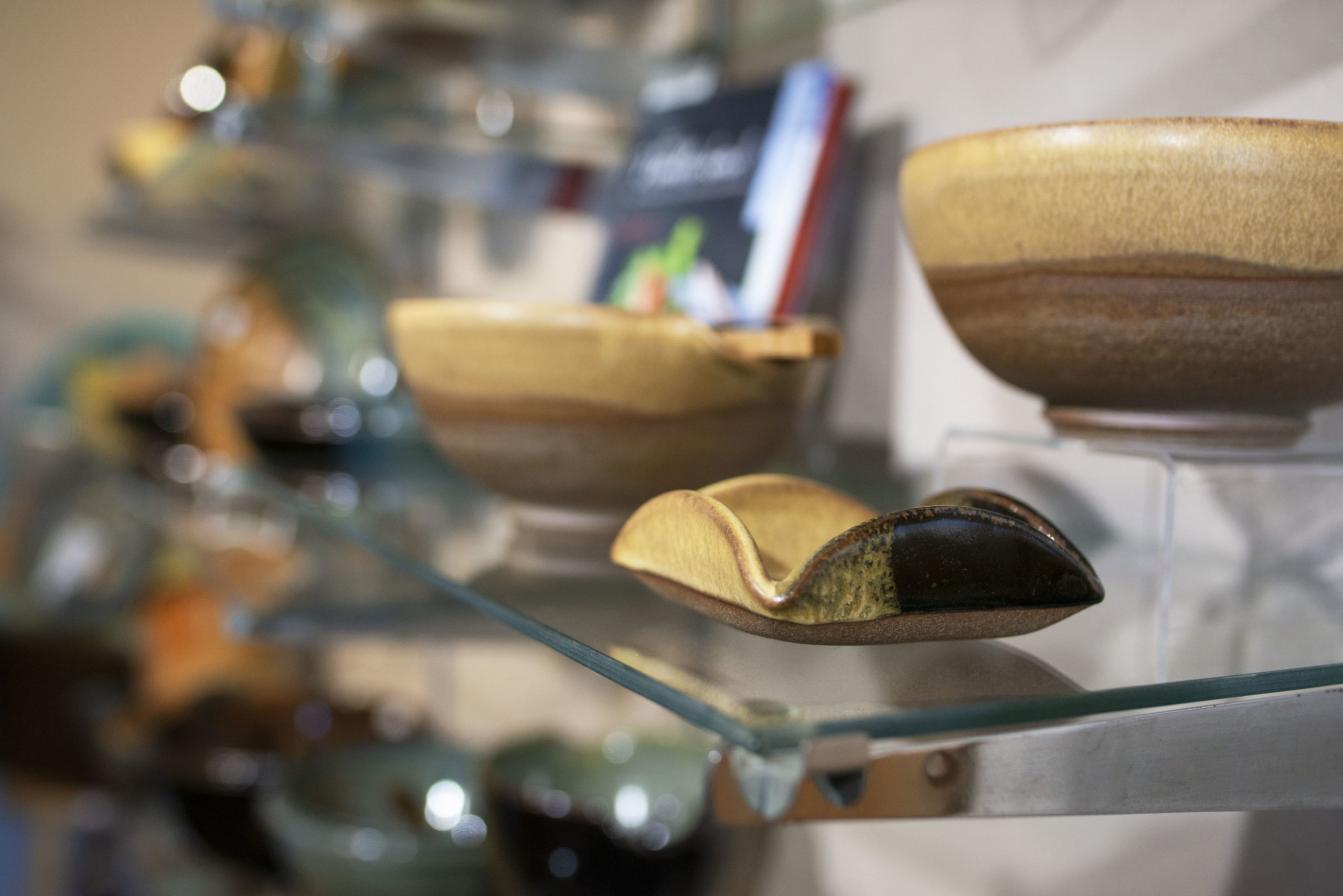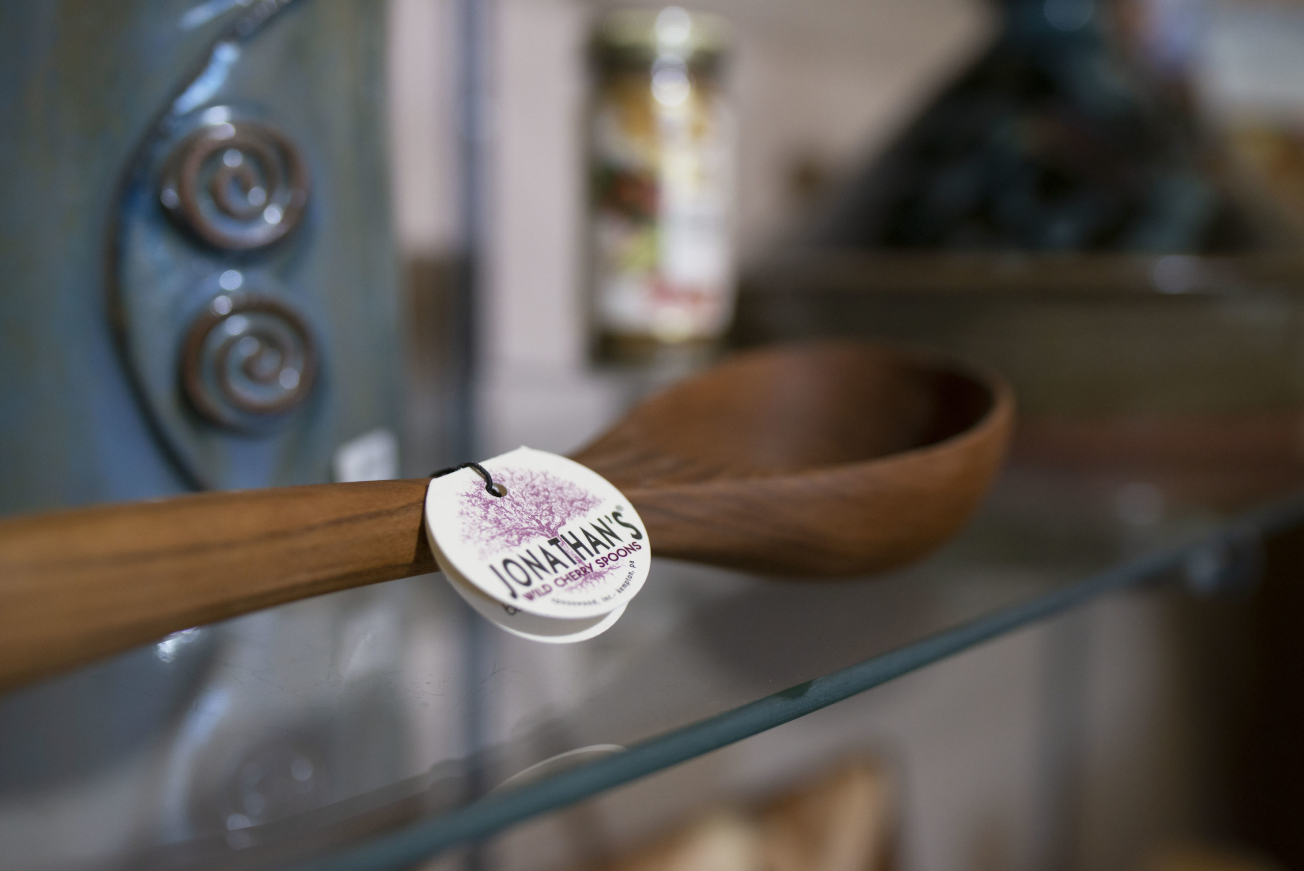 a horizontally framed photograph shows a very close picture of a Jonathan's wild cherry spoon, sitting on a glass shelf, behind it and to the left part of a clay coyote wine chiller/utensil holder is visible.