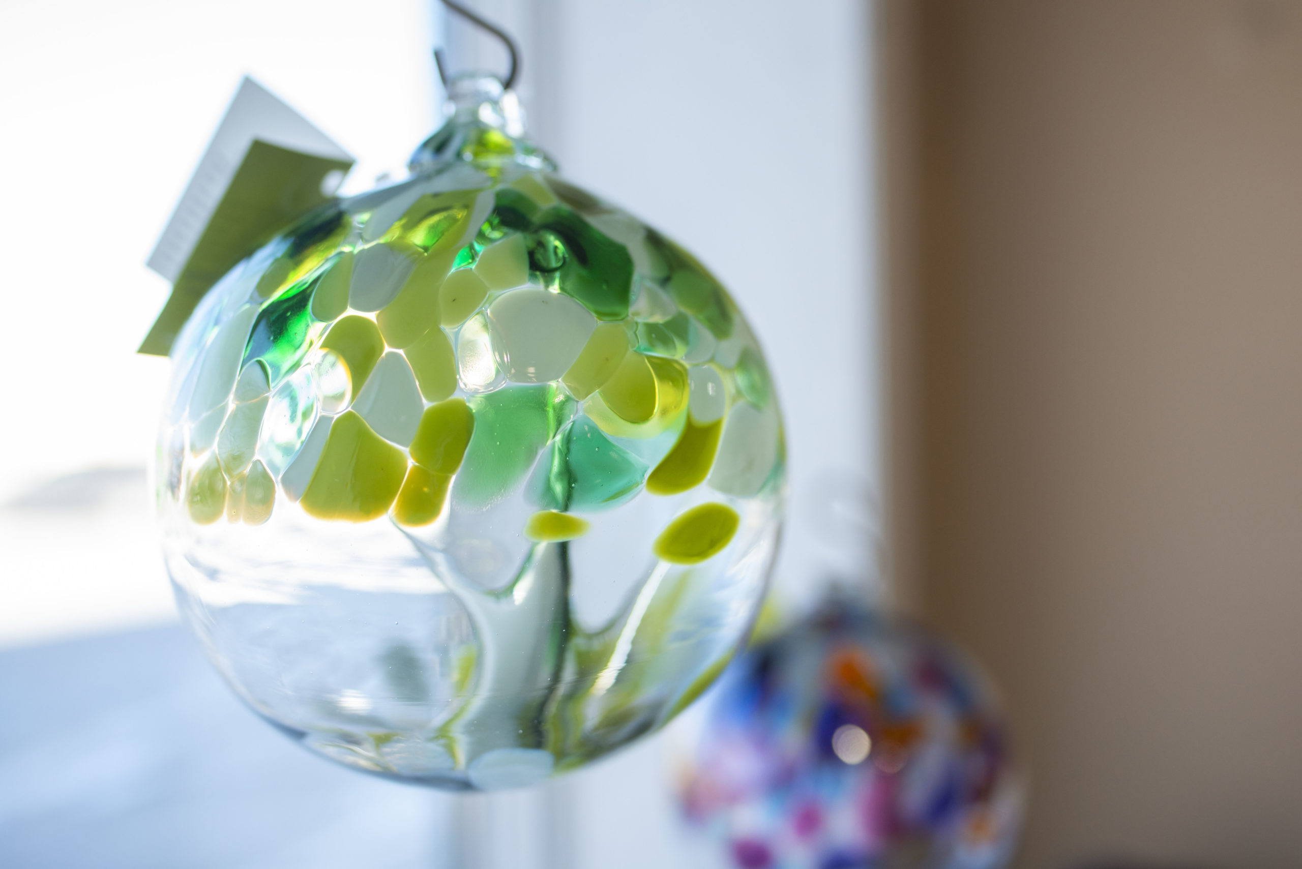 a horizontally framed photograph shows a kitras blown glass ball, hanging in a window. the blown glass sphere has been blown to resemble a tree on the inside, made of clear glass, the bottom of the sphere is clear also. the top half of the orb is multicolored with greens and whites representing the leaves of the "tree" contained within. the background is out of focus.