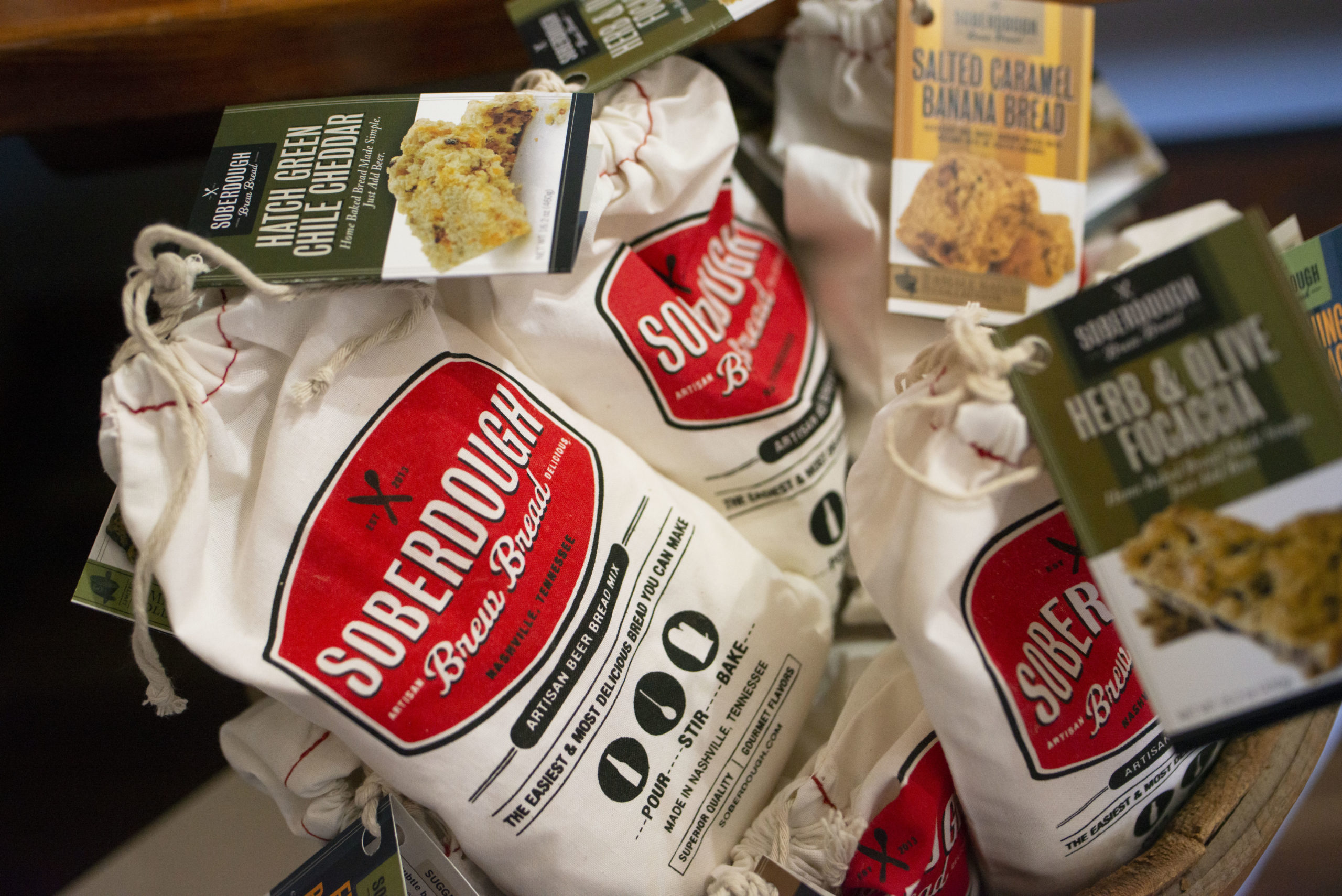 a horizontally framed photograph shows a close up photograph of Soberdough brand mixes of bread. there is a tag visible for herb and olive focaccia and hatch green chile cheddar. they are white cloth bags with red badge branding of their logo.